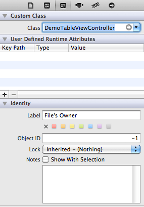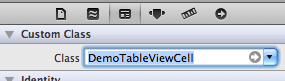 Then open the Utilities panel on the right side of Xcode 4, select the Identity Inspector icon, and then change the Class field to the name of the UITableViewController that will create/display this custom cell. In this example, I changed it to “DemoTableViewController”.