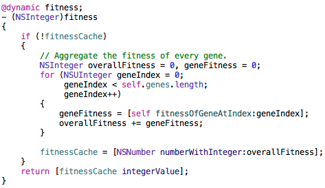 That property calculates the fitness of each gene and caches the sum. The result is cached to improve performance, since this property can be accessed multiple times for a chromosome. The helper method that calculates the fitness of a given gene is seen here: