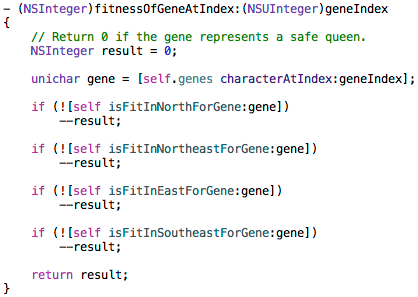 This method searches in four directions, as discussed earlier, to look for other queens that are attacking the queen represented by the gene at the given index. Let’s take a look at the code that searches North and East for attacking queens. This code shows how the genetic encoding system is used to translate genes into information about the problem domain, namely, the squares in which queens exist.