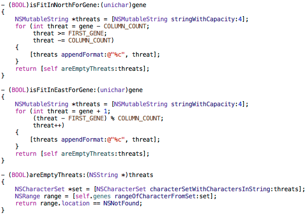 The translation of genetic information to problem domain information occurs in the for() loops. The ‘threat’ variable in those loops identifies a chessboard square. A list of chessboard square identifiers is appended together and passed to the areEmptyThreats: method for analysis. That method checks to see if the chromosome’s gene sequence contains any of those chessboard square identifiers. If so, that means a queens exists on one or more of those squares.