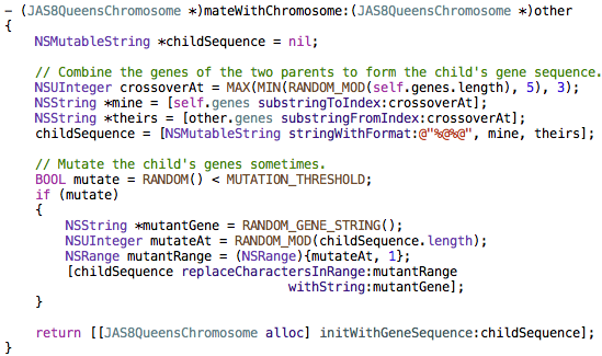 There is a lot more going on in the demo program than what I’ve shown here, so I encourage you to grab it off github and take a look. One particular point of interest is how JAS8QueensChromosome overrides the hash and isEqual: methods to help the algorithm avoid adding equivalent chromosomes to the population.