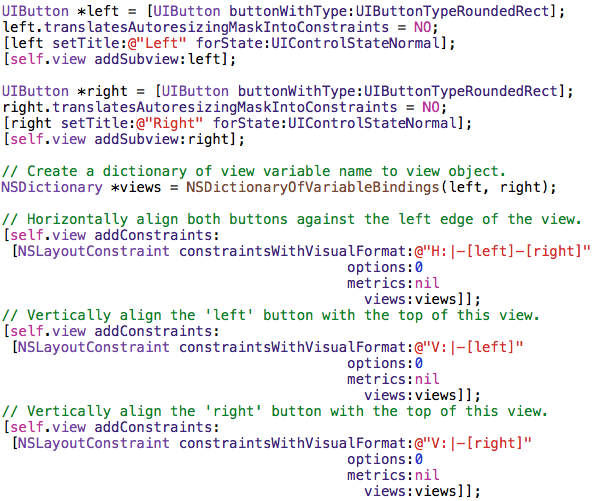 There is an ASCII-art inspired language named Visual Format Language (VFL) that can be used to ideographically express relationships between views. VFL text is written in code files, not IB, and acts as a facade over the cumbersome underlying API. Similar to the layout constraints support in IB, this language supports a subset of the functionality available in the API.