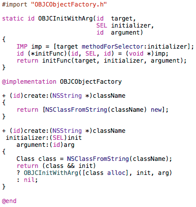 The implementation of OBJCObjectFactory is short and straightforward, if you know Objective-C that is! Note that the single-parameter initializer selector is invoked through a pointer to a function, instead of the standard performSelector:withObject: method, because it eliminates a compiler warning and establishes a pattern that can be extended to include an arbitrary number of initializer arguments.