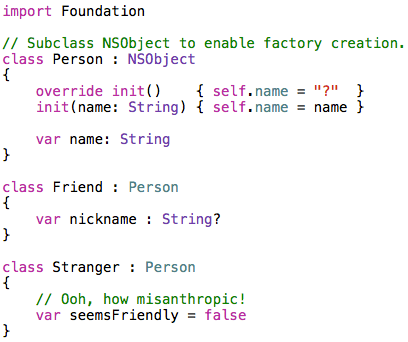 As I mentioned before, there does not appear to be a way to instantiate a class by name in the Swift API. I was able to get an object that represents a class (named AnyClass), but there was no way to get from there to a live instance of that class. So instead, I hopped into the parallel universe of Objective-C to create an object, which then gets returned back to Swift. This is why ObjectFactory can only work with NSObject subclasses; I’m relying on Objective-C to alloc/init a new object, and those methods are defined by NSObject.