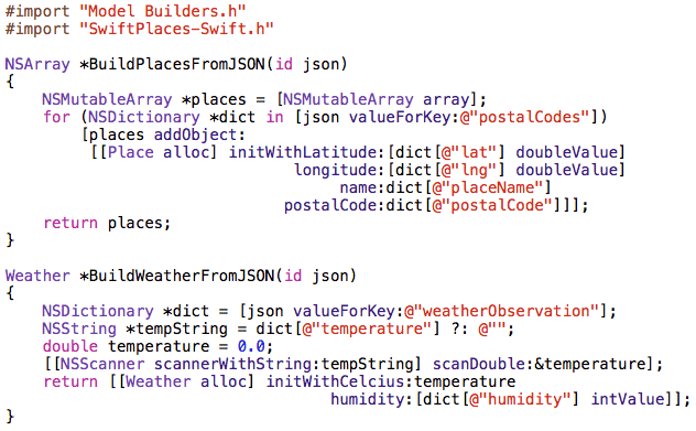 I decided to write the JSON-to-model conversion code in Objective-C, because Swift’s type safety is at odds with such an inherently “type unsafe” task. There has been quite a lot of activity and debate around JSON processing in Swift, but I found it was just plain easier to write that code in Objective-C. The following code is from Model Builders.m: