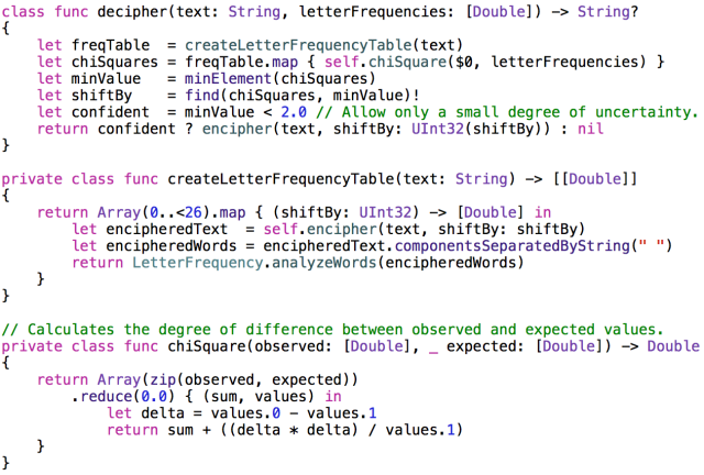 The core idea in the decipher method is to try all 26 possible character mappings and find the one whose relative letter frequencies most closely match the expected letter frequencies. The expected frequencies are calculated on-the-fly, by analyzing a list of English words included in OS X. The LetterFrequency class is responsible for that.