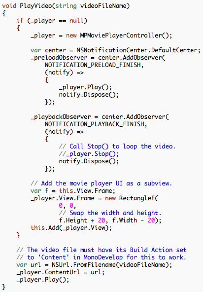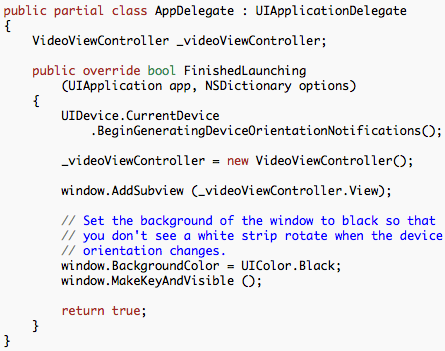 We are done using Interface Builder, so save and go back to MonoDevelop. Open Main.cs and include the line of code that adds the navController’s View as a sub-view of the window. This is how our “home” view is added to the UI.